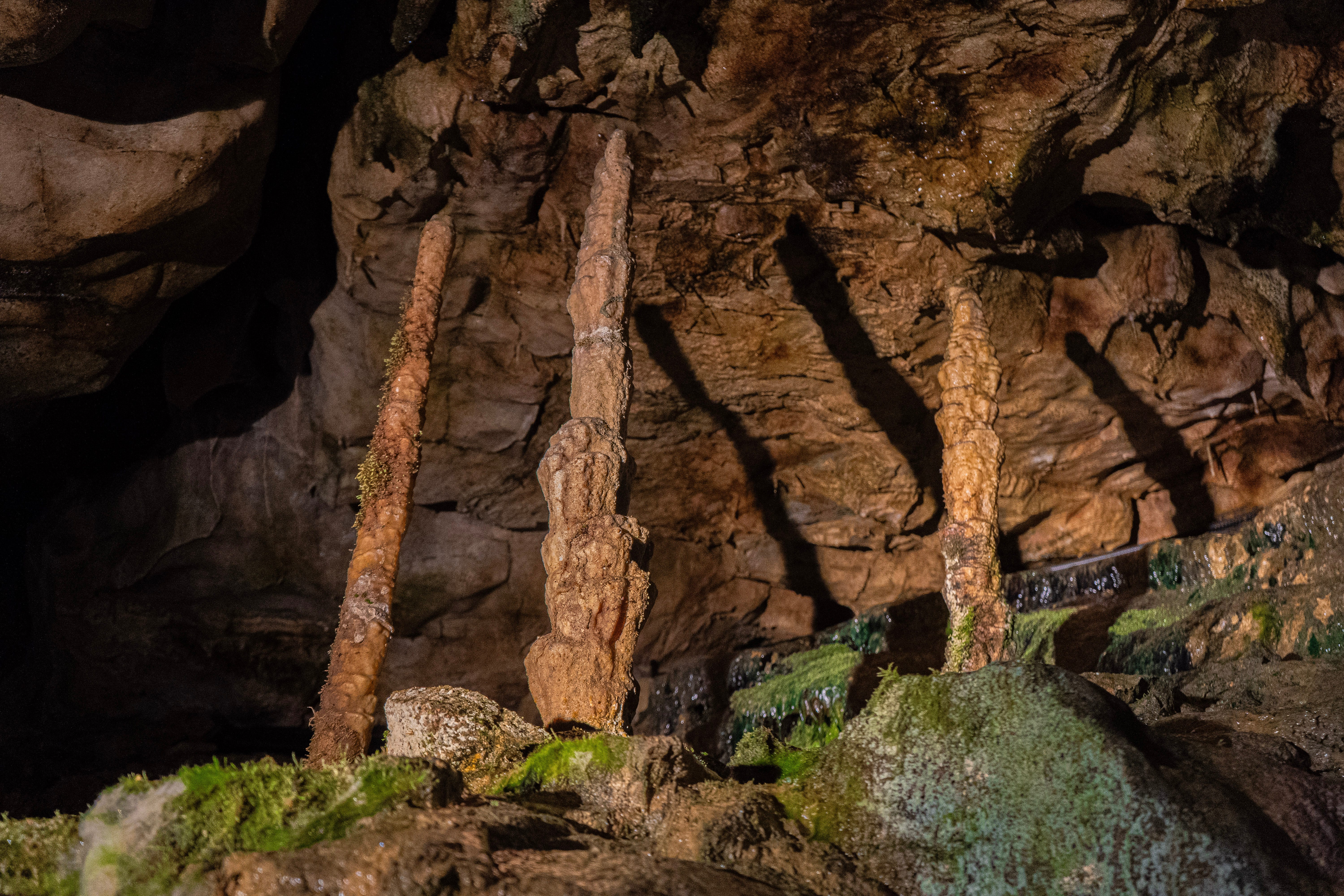 The water from precipitation deposits new mineral layers on the stalagmites and stalactites in the cave.