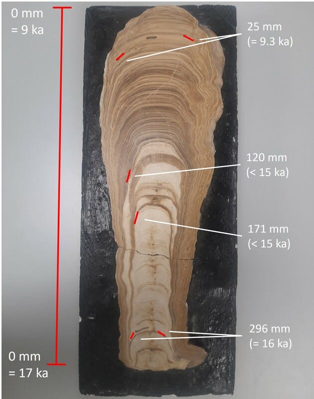 Each new mineral layer preserves the carbon and oxygen isotopes reflecting the environmental conditions of that period.