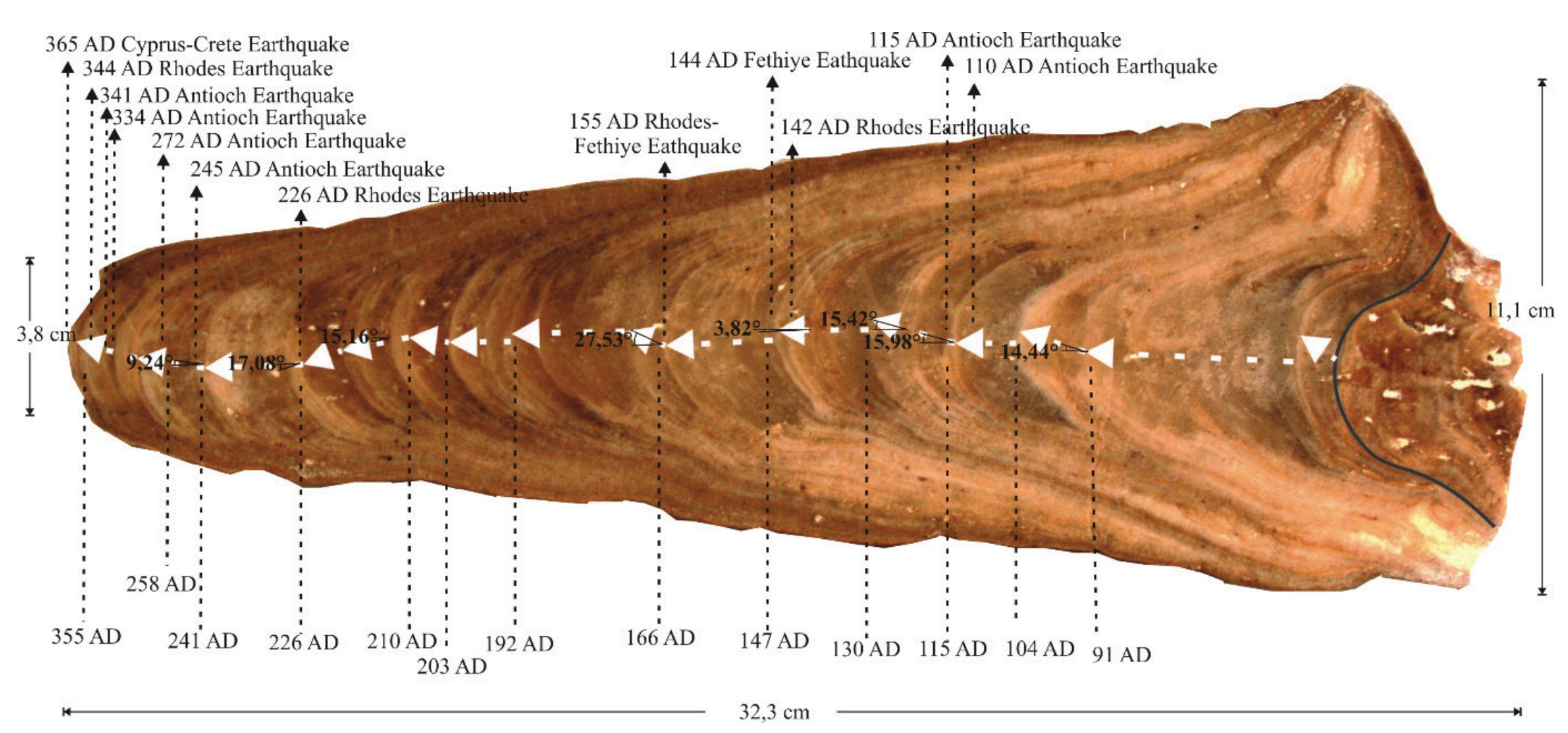 By analyzing the irregularities along the central axis of the stalagmite, tectonic activities in the region can also be studied. The following cross-section belongs to a stalagmite taken from a cave in the Mersin region for paleoseismology research. The shifts in the axis dates closely align with past earthquakes in the cave’s surrounding area.